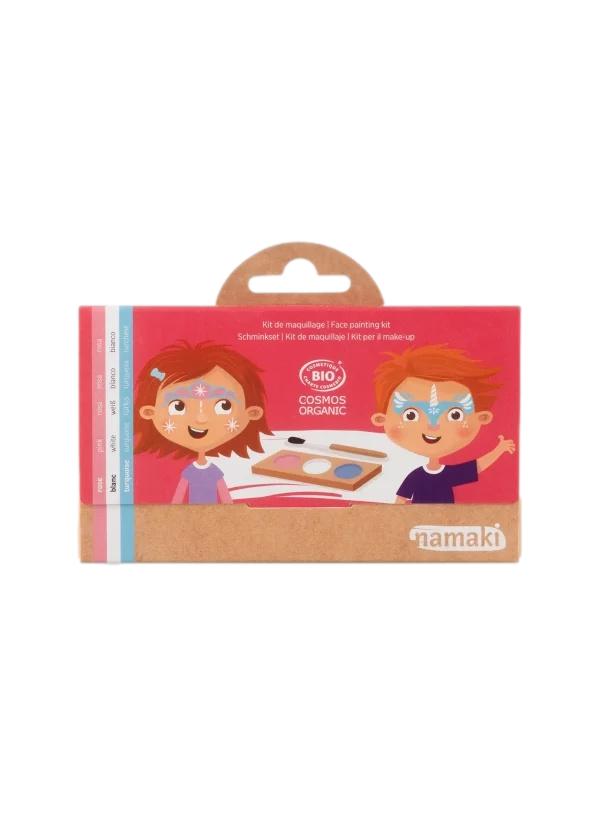 Imaginez-vous dans un château enchanté, là où les princes et princesses dansent et les licornes galopent. La palette Princesse & Licorne est la promesse d’un voyage enchanté à chaque application. Avec Namaki, donnez vie à votre imagination ! •3 couleurs, 2 modèles : rose, blanc, turquoise pour se transformer en licorne ou plonger dans l’univers féerique des bals de châteaux. •Tout-en-un : ce kit comprend un pinceau cosmétique et 2 tutoriels. •Respectueux de la peau : certifiée Cosmos Organic et testée sous contrôle dermatologique, cette palette est conçue pour être hypoallergénique et sans risque pour la santé. •Texture de rêve : formulée à base de poudre de riz bio, sa texture douce et soyeuse garantit une application sans effort. •Polyvalence : capable de réaliser jusqu’à 10 maquillages différents, elle est idéale pour un usage quotidien ou des occasions spéciales. •Démaquillage facile : s’enlève à l’eau et au savon. •Sécurité : conforme à la norme CE des jouets pour s’amuser sans tracas. •Engagement écologique : packaging éco-conçu et recyclable