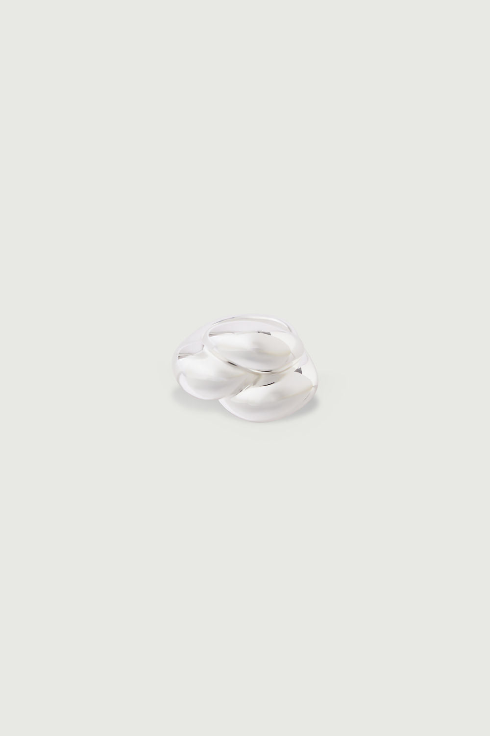 •La ligne ROSACE explore un design sculptural aux volumes croisés, comme formés par un enroulement de pétales métalliques. •Bague en argent.