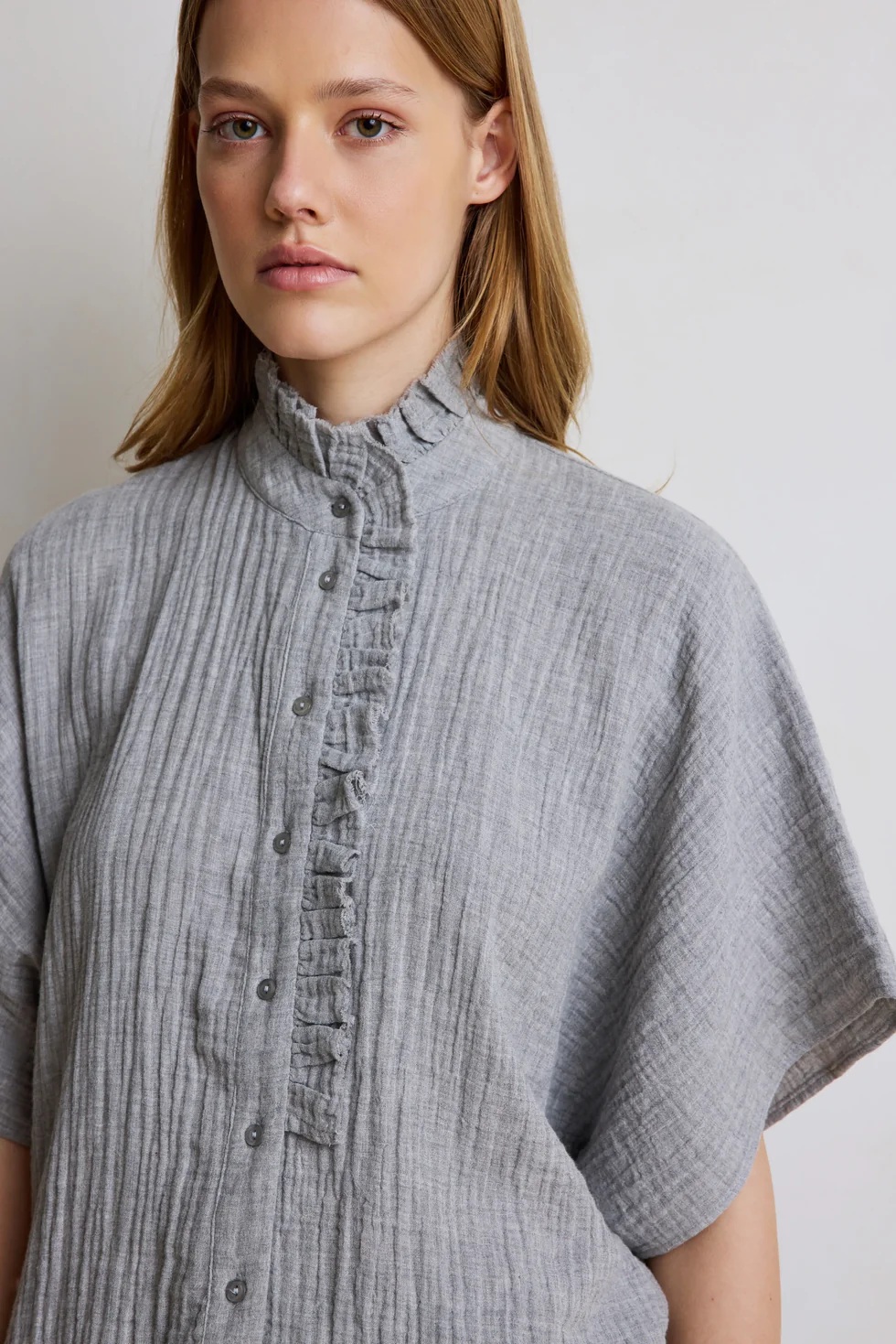 Natasha est une chemisette aux manches courtes possédant un joli détail "froufrou" à la boutonnière et au col. • Chemise manches courtes • Col boutonnière fantaisies "froufrou" • Boutonnée • Coupe oversize