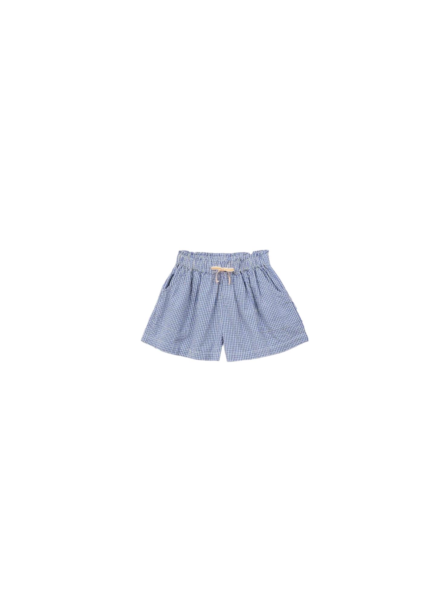 Short vichy cobalt • Tissu seersucker vichy • Entièrement élastique à la taille avec un cordon fantaisie • 2 poches plaquées sur les côtés • Étiquette drapeau insérée à la couture côté