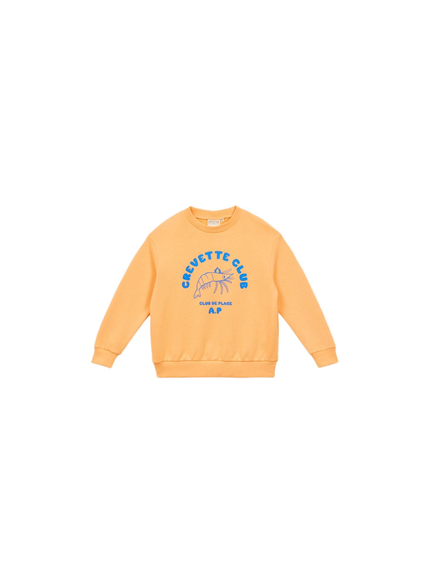 Sweat crevette club abricot • Molleton en coton bio et émerisé • Coupe loose • Col rond • Finition bord côte au col, poignets et bas de corps • Impression "Crevette club" au milieu devant