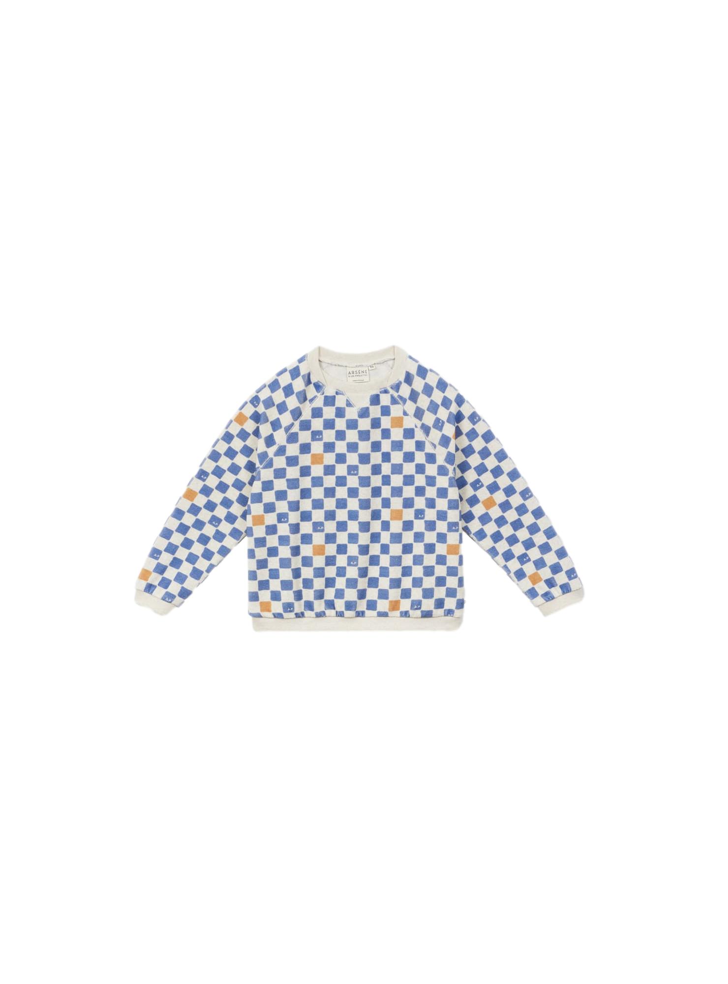 Sweat éponge cobalt • Tissu en éponge imprimé damier avec du coton certifié bio • Coupe relax • Col rond avec détail "V" • Manches raglans • Finition bord côte au col, poignets et bas de corps