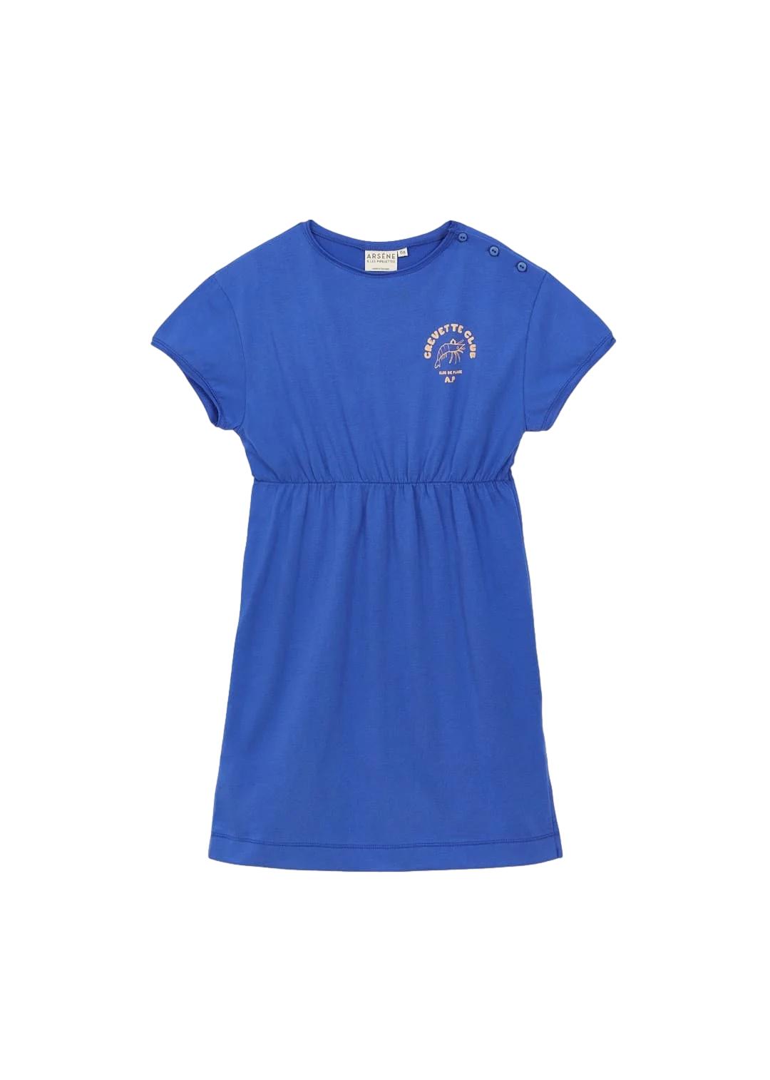 Robe en jersey crevette club cobalt • Jersey en coton bio • Col rond • Taille élastiquée • Impression "Crevette club" à la poitrine et au milieu dos • Fentes sur les côtés du bas de la robe