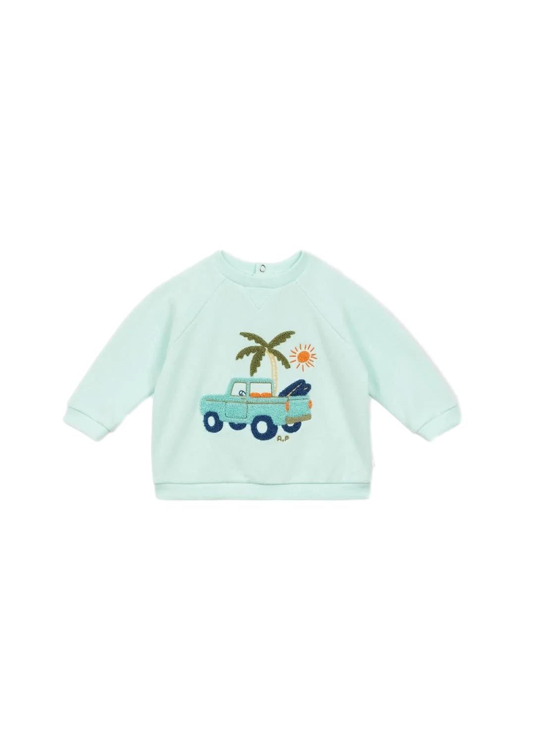 Sweat bébé pick up azur • Molleton en coton bio et émerisé • Col rond • Forme relax, manches raglans • Détail "v" au col • Finition bord côte aux poignets, bas du corps et au col • Broderie bouclette "Pick up" sur le milieu devant • Ouverture au dos avec 3 pressions