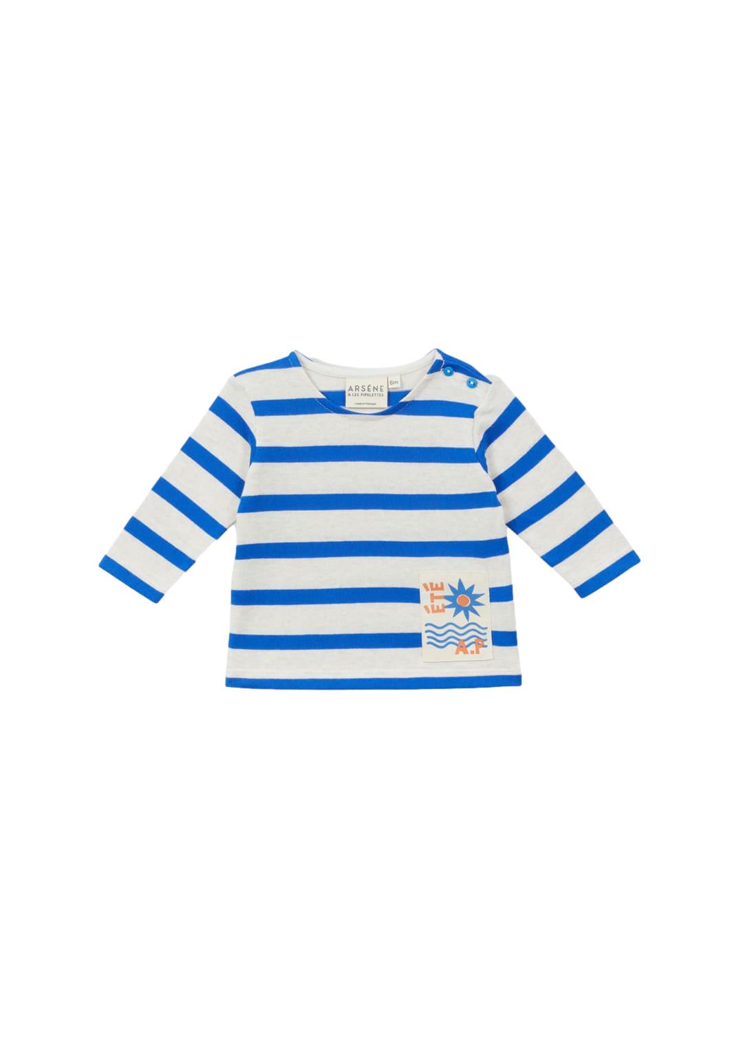 Marinière bébé bleu electric • Jersey rayé en coton organique certifié bio • Col rond • Forme droite, manches longues • Finition bande intérieur col • Ourlet au bas de manches et corps • Ouverture boutonnée à l'épaule