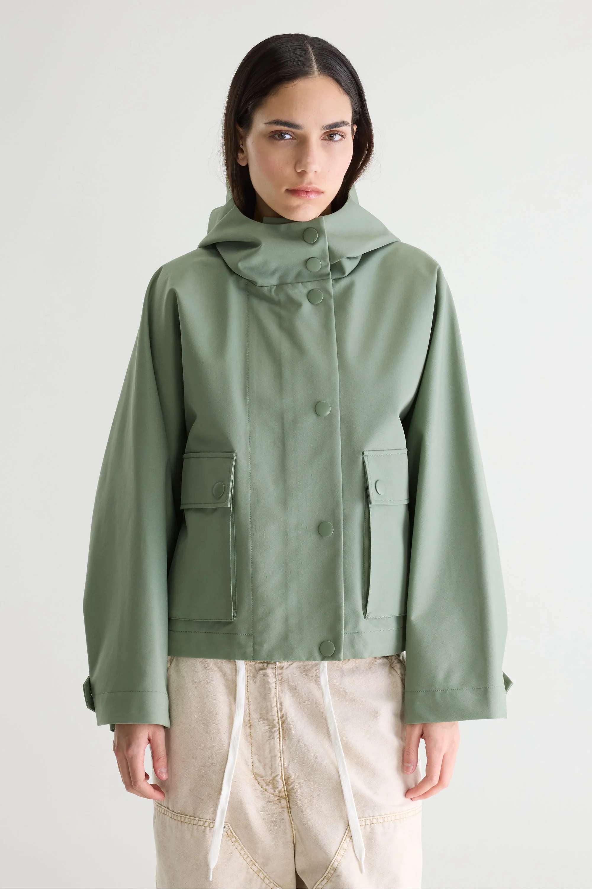 Veste décontractée à capuche kaki clair avec boutons-pression, poches à rabat et poignets ajustables. • Coupe décontractée et carrée • Capuche attachée • Manches longues avec poignets ajustables à boutons-pression • Deux grandes poches à rabat sur le devant avec boutons-pression • Fermeture à boutons-pression sur le devant avec fermeture éclair dissimulée • Couleur vert kaki clair