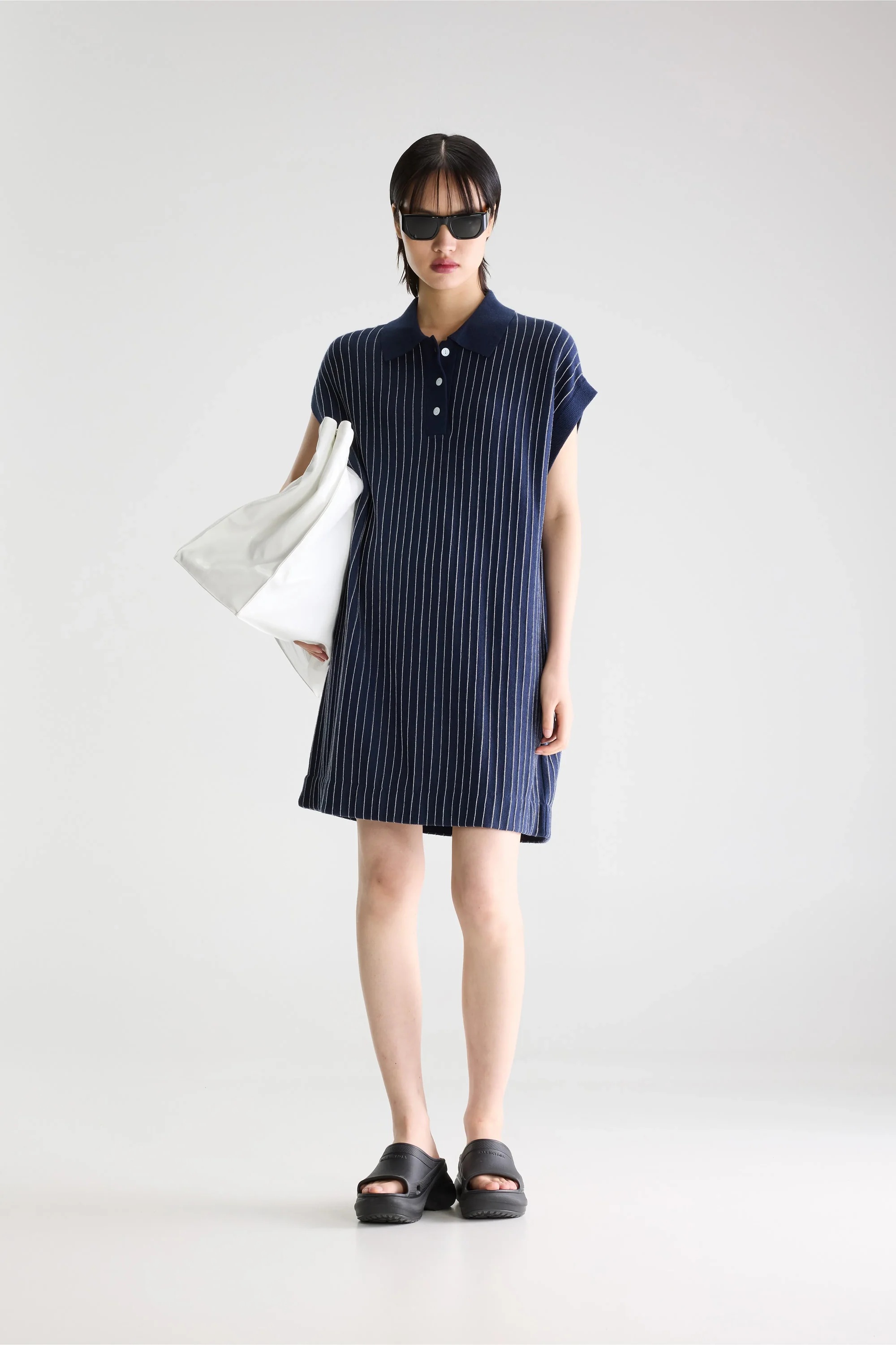 Robe sans manches en maille bleu marine à fines rayures verticales blanches et col polo, coupée dans une longueur décontractée au-dessus du genou. • Coupe décontractée • Longueur au-dessus du genou • Col polo • Coupe sans manches avec emmanchures larges et structurées • Rayures verticales • Tissu en maille côtelée