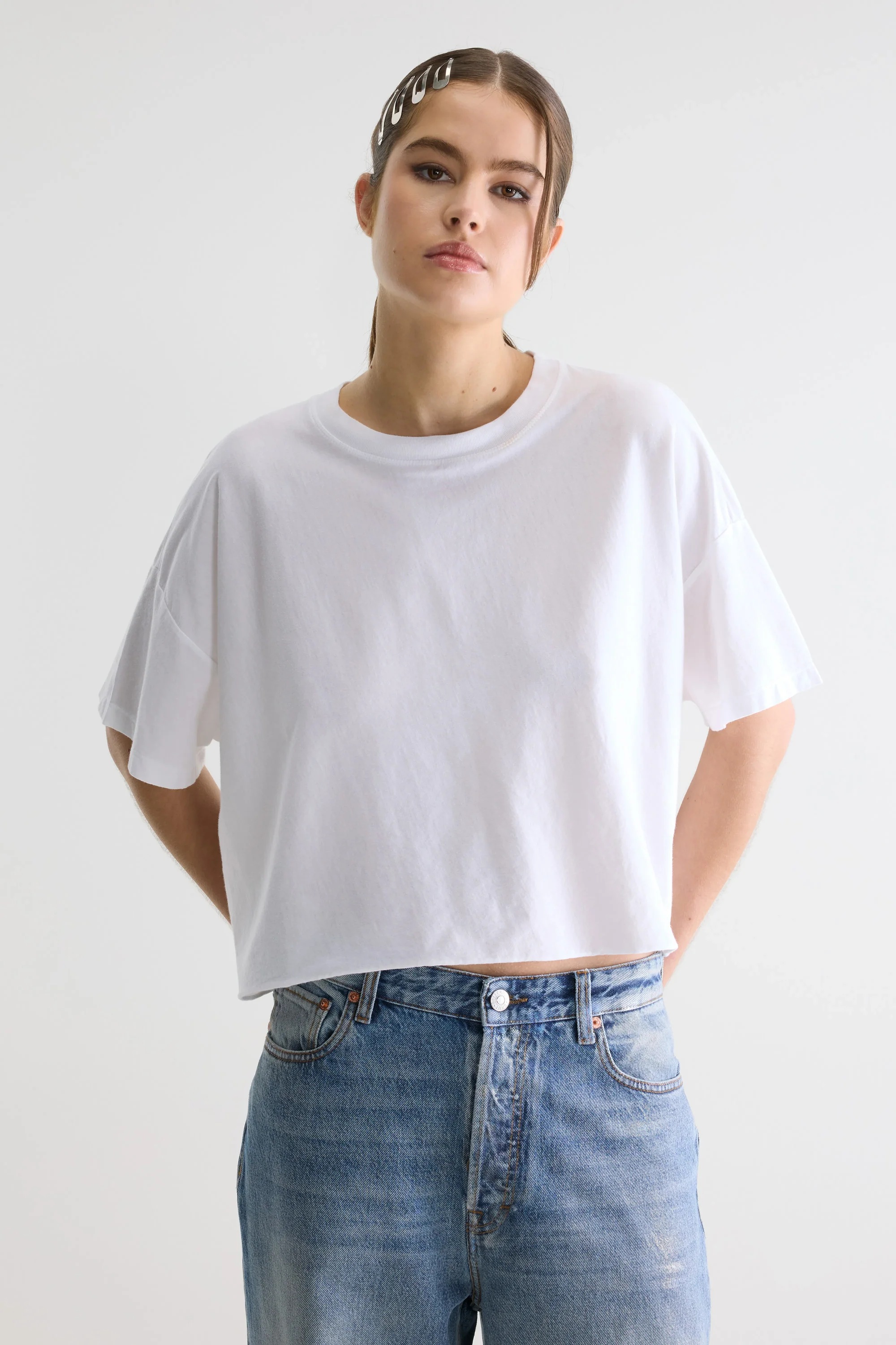 Tee shirt court oversized avec couture dans le dos, confectionné en jersey de coton léger blanc. Coupe courte oversized : choisissez votre taille habituelle pour le look souhaité ou une taille en dessous pour une coupe plus ajustée. • Manches courtes • Encolure ronde • Couture dans le dos • Logo « rose » brodé ton sur ton à l'ourlet • Jersey de coton léger, 125 g/m²