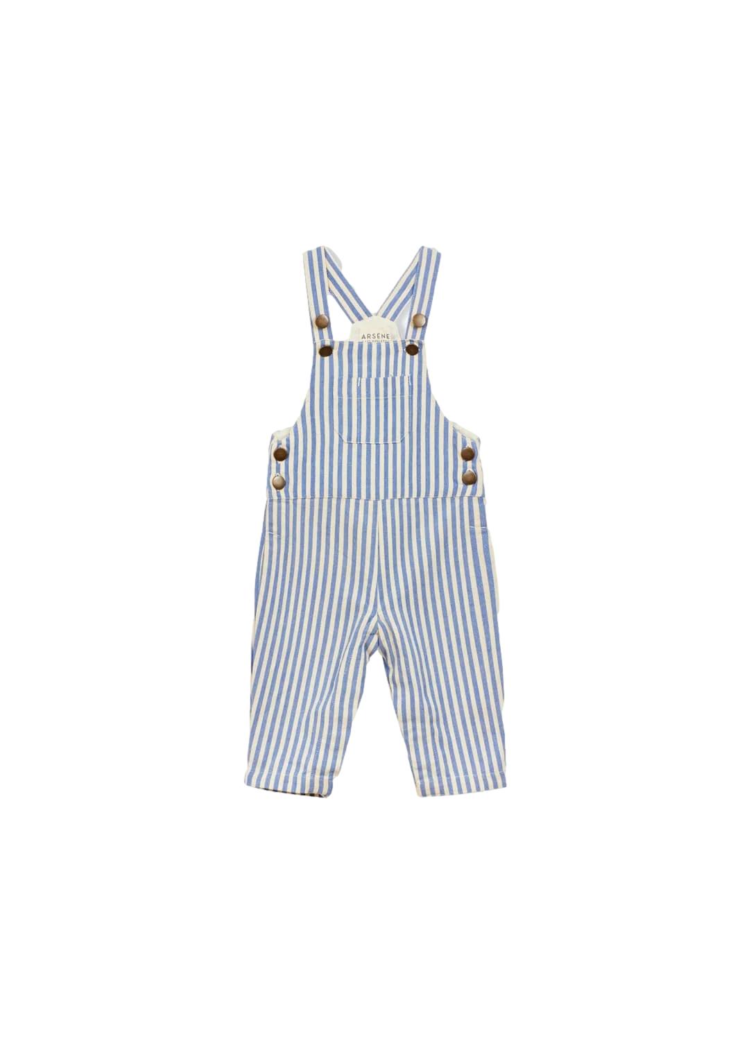 Salopette bébé denim à rayures cobalt • Tissu en denim rayé 100% coton • Bretelles ajustables par système de boutons sur le devant • Ouverture pressionnée à l'entrejambe (excepté pour la taille 36 mois) • 1 poche plaquée sur le devant et une sur le dos