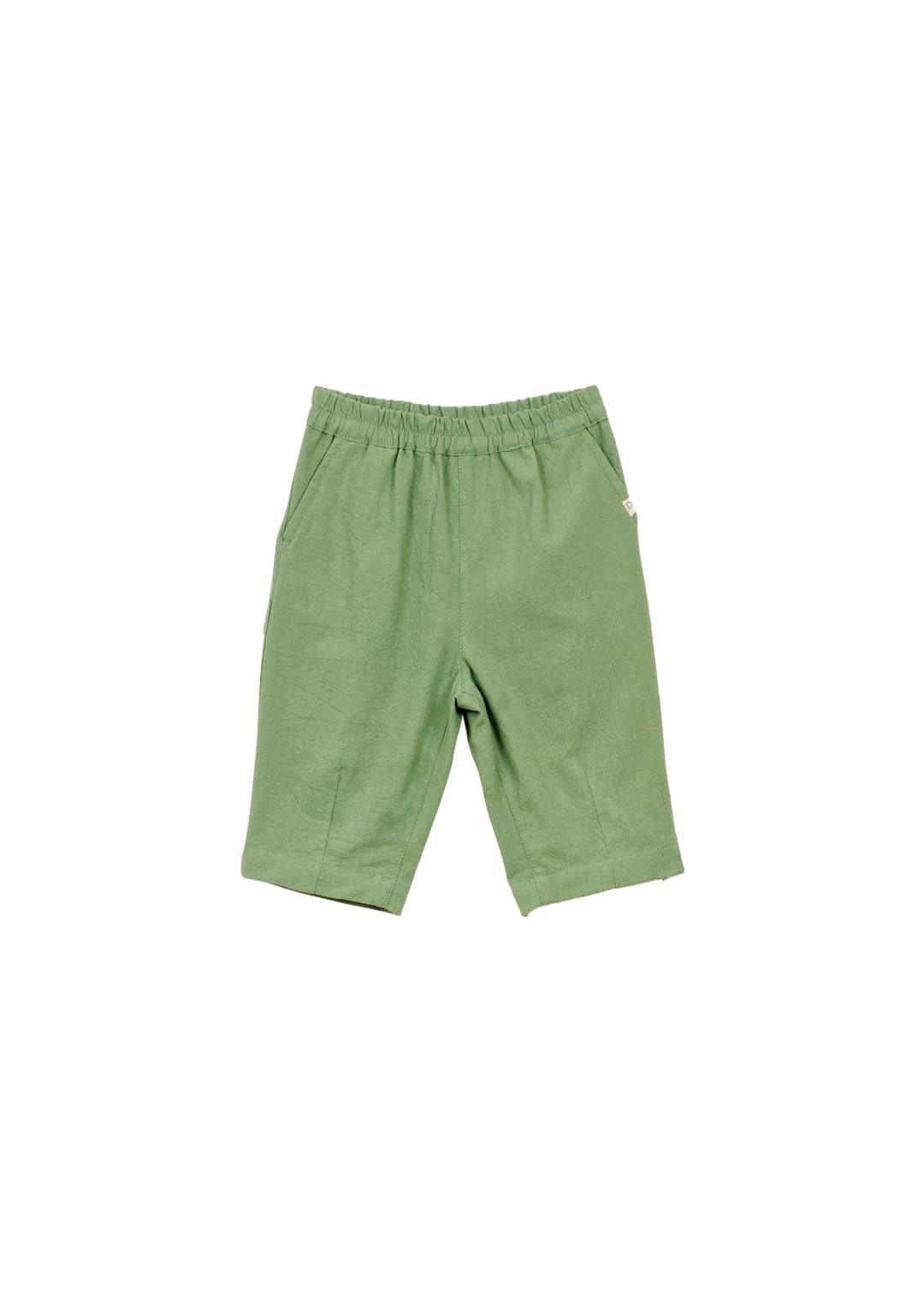 Pantalon bébé coton rustique vert kaki • Tissu en coton texture • Taille élastiquée • Poches insérées sur les coutures côtés • Poche plaquée sur le dos avec "AP" imprimé contrasté